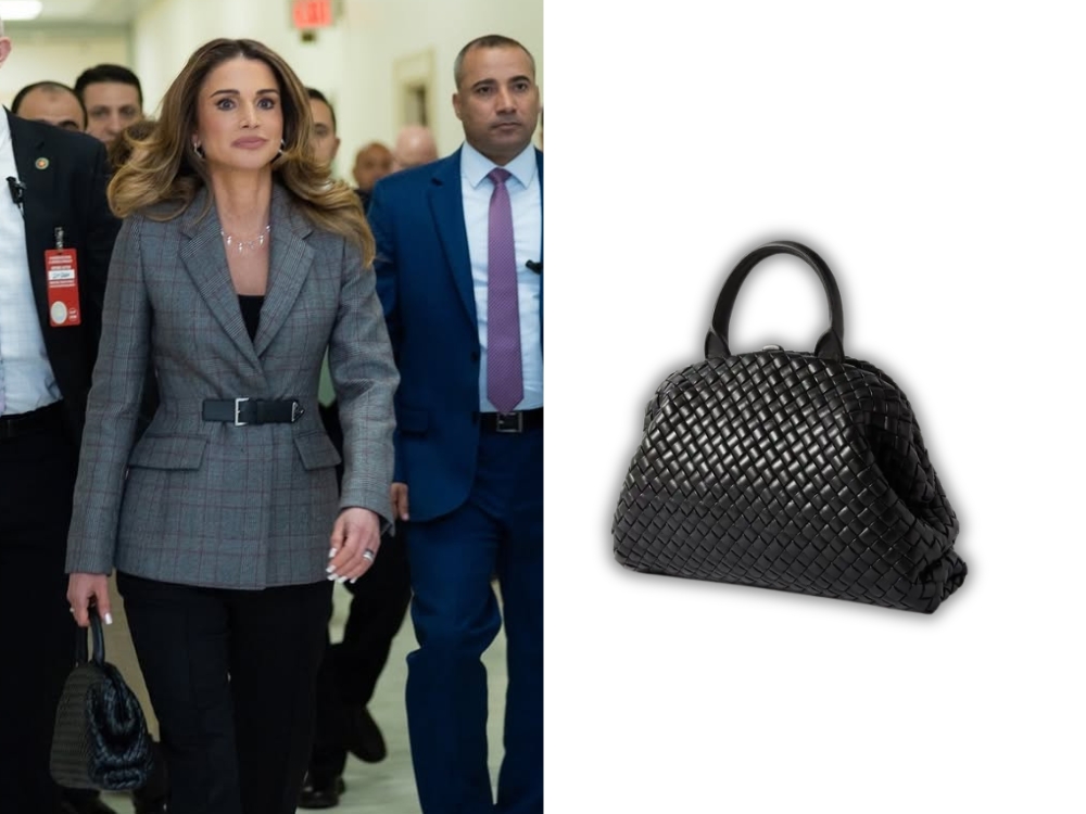 The bag is iconic, a masterclass in quiet luxury from Bottega Veneta. Its signature Intrecciato weave transforms craftsmanship into presence, speaking volumes without a single logo. Perfectly suited to meetings, conferences and high-level forums, it’s no surprise that Queen Rania of Jordan has carried it repeatedly to official engagements.