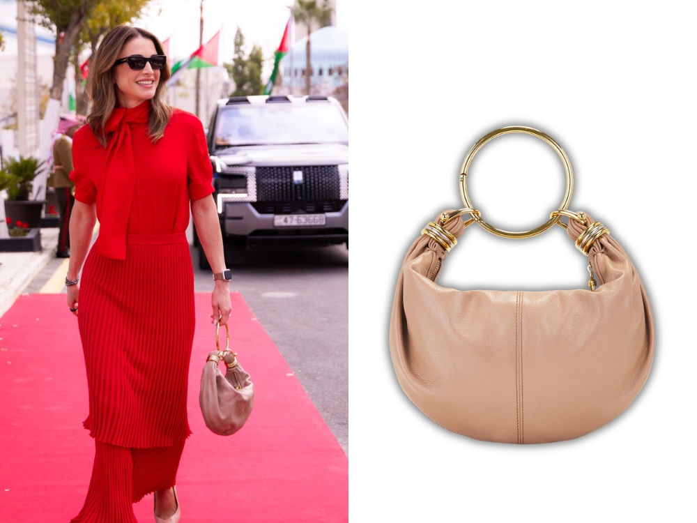Tapping into a more romantic vibe, Queen Rania Al Abdullah has been frequently seen carrying the crescent‑moon-shaped Chloé Bracelet Bag in Woodrose. The piece, with its soft curves and signature bracelet handle, has quickly earned its status as an ‘it’ bag, perfectly blending boho-chic charm with timeless elegance.