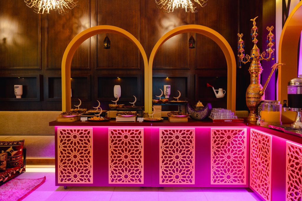 Le Méridien Mina Seyahi leans into a more animated, family-driven atmosphere. Latest Recipe hosts expansive iftar buffets that combine regional favourites with international comfort food, complemented by live terrace stations that bring energy and movement into the evening. Suhoor follows in-room, echoing traditional breakfast flavours with lighter sweet finishes.