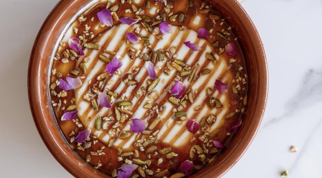 Her menu also turns its attention to dates, one of the country’s most beloved ingredients and central to Ramadan. It is used almost as a condiment across the menu. For her wagyu kebabs, she transforms the dates into a tangy vinegar sauce to glaze the meat and give subtle flavor. For dessert, the dates are cooked into a syrupy molasses for a caramel-like flavor.