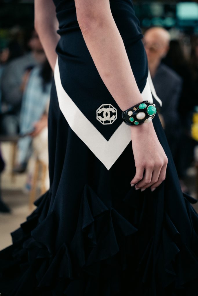 The accessories of the collection reinforce the idea of a journey, spanning the practical and playful across an abundance of styles. From a small valise handbag to a full-grown holdall; from a waterproof flap bag to a giant striped beach panier. Even a pala carrier makes an appearance. Shoes straddle both salon and beach, taking the wearer wherever they please, from elegant Art Deco heels to barefoot ‘heel caps.’ The jewellery, too, echoes the Art Deco architecture of Biarritz, alongside its life aquatic, where shell earrings are held to the ear, and the CHANEL pearl finds its spiritual home.