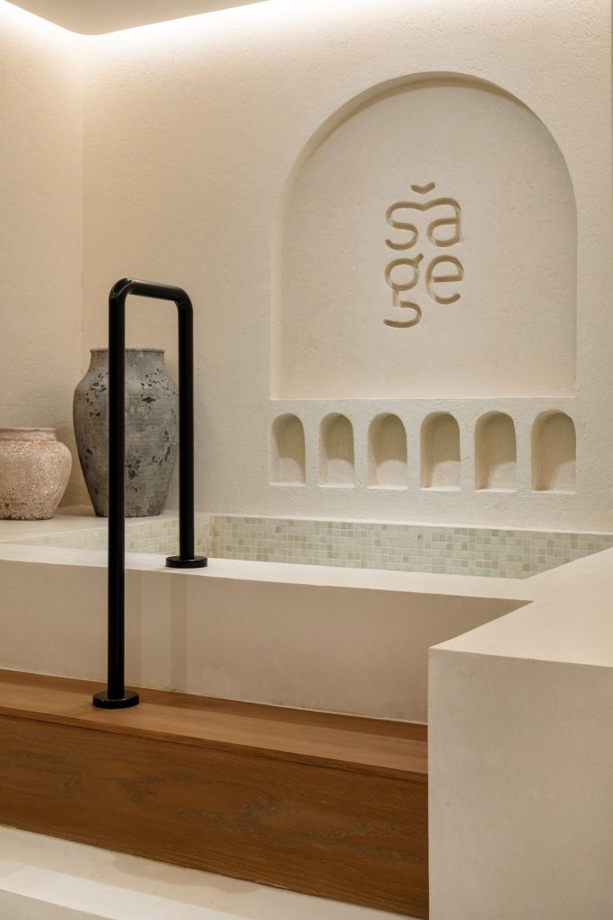 Not far away, in Jumeirah 1, Villa Sage makes a case for interiors as a form of therapy in their own right. Curved plaster walls, neutral tones, warm wood, pockets of greenery, and natural light give the space a relaxed, residential feel.  Founded by close friends Irina and Karina, the studio is built around the philosophy of the Art of Balance, drawing its name from the dual meaning of sage: a wise person, and a sacred plant used in spiritual practices to reduce stress.  The schedule spans Jivamukti, Ashtanga, Yin, and Nidra yoga, alongside osteopathic massage, sauna, hammam, and cold plunge. A palette of beige, white, camel, and soft brown runs throughout, with low seating, textured fabrics, and warm wood accents keeping the atmosphere consistently understated.  The on-site café, Angel Cakes, serves gluten-free, refined-sugar-free dishes and an extensive matcha menu. In a city that tends to externalise luxury, Villa Sage turns inward.