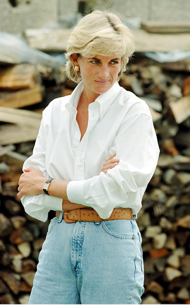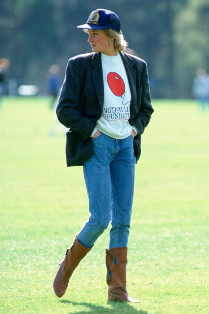 Diana’s 90s wardrobe reflected independence and control. She paired cycling shorts with sweatshirts and structured jackets, creating a formula that still defines off-duty dressing. Her eveningwear carried equal intent, from sculpted gowns to the now-iconic black off-shoulder dress.