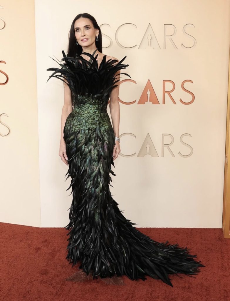 Demi Moore delivered one of the night’s most dramatic ensembles in a feathered Gucci gown designed during Demna’s era as artistic director of the house. The design featured cascading feathers that moved from the bodice down to a sweeping train. A plume of long black feathers framed the upper bodice before transitioning into glossy green feathers at the cinched waist, creating a bold and theatrical silhouette that commanded attention on the carpet.