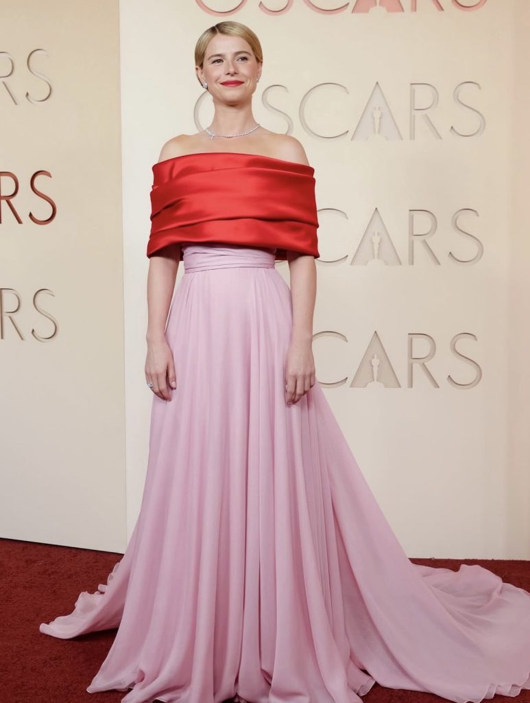 Among the standout appearances was Jessie Buckley, who arrived in a striking two-tone Chanel gown. The design played with bold colour blocking, featuring a red, ruched off-the-shoulder bodice that flowed into a soft pink waist and skirt. The silhouette moved elegantly down the carpet, with the skirt trailing behind the two-time Oscar-nominated actress as she made her entrance.