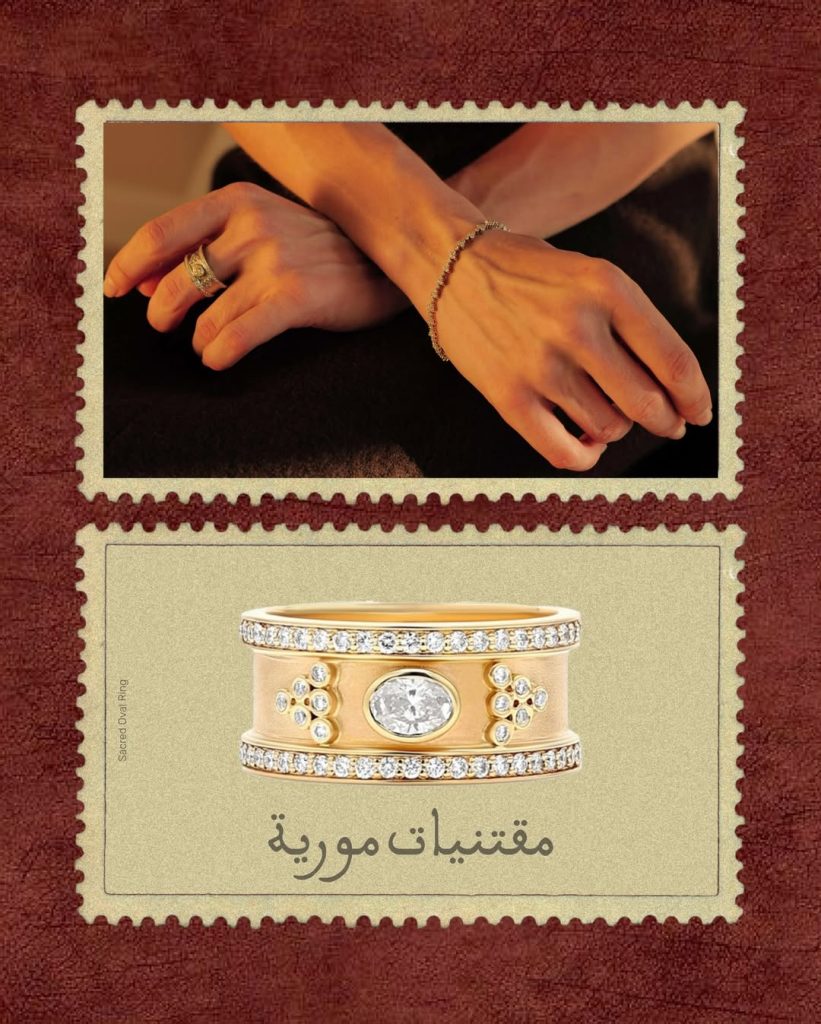 Sacred Geometry explores the visual language of ancient forms, translating them into pieces that are graphic and contemporary. Al Jawhara turns to heirloom traditions, framing gemstones and protective amulets as symbols of continuity between generations. Vintage Mahra channels regional amulets through stones such as onyx and malachite, while Mishawak reinterprets spike jewellery from the Arabian Peninsula with a sharper, more modern edge. Qamariya, inspired by Yemeni stained glass windows, introduces colour through sapphires and diamonds, capturing light in motion.
